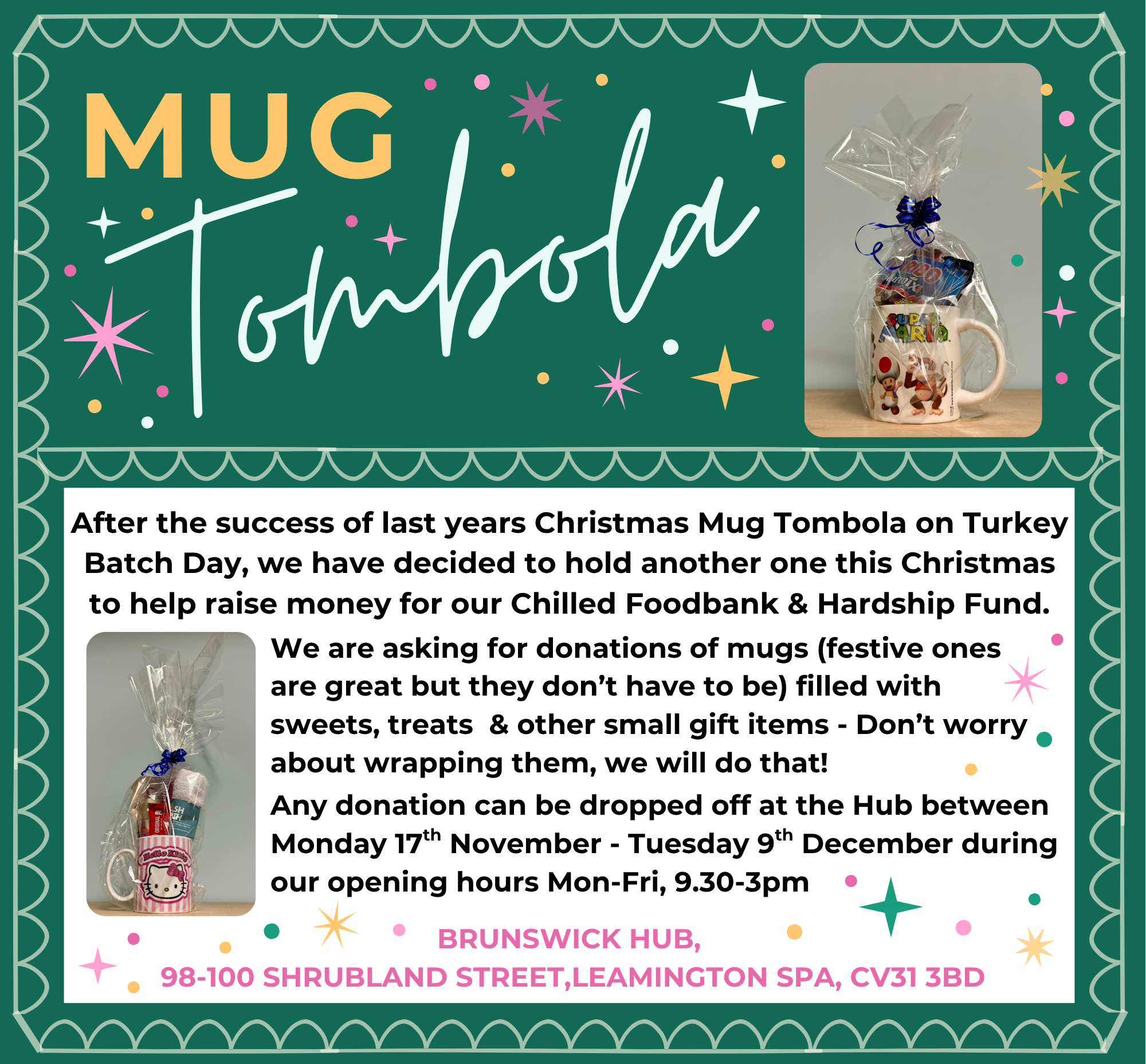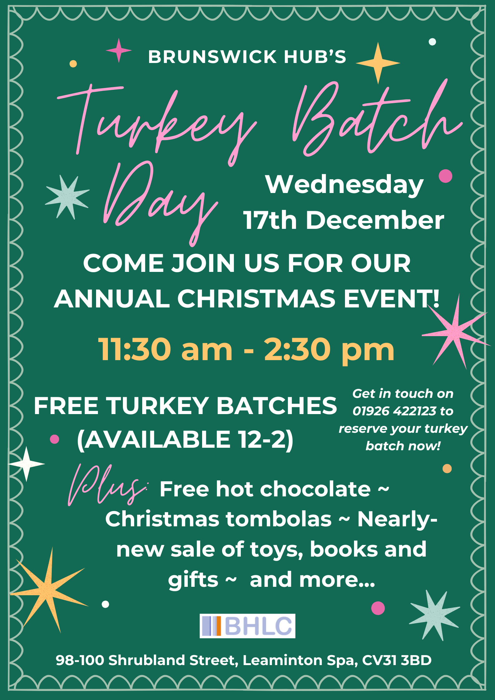 It isn’t essential to book, but you can get in touch with us from 1st November to reserve your free turkey batch to avoid disappointment on the day! Call us on 01926 422123 or email frontdesk@brunswickhlc.org.uk