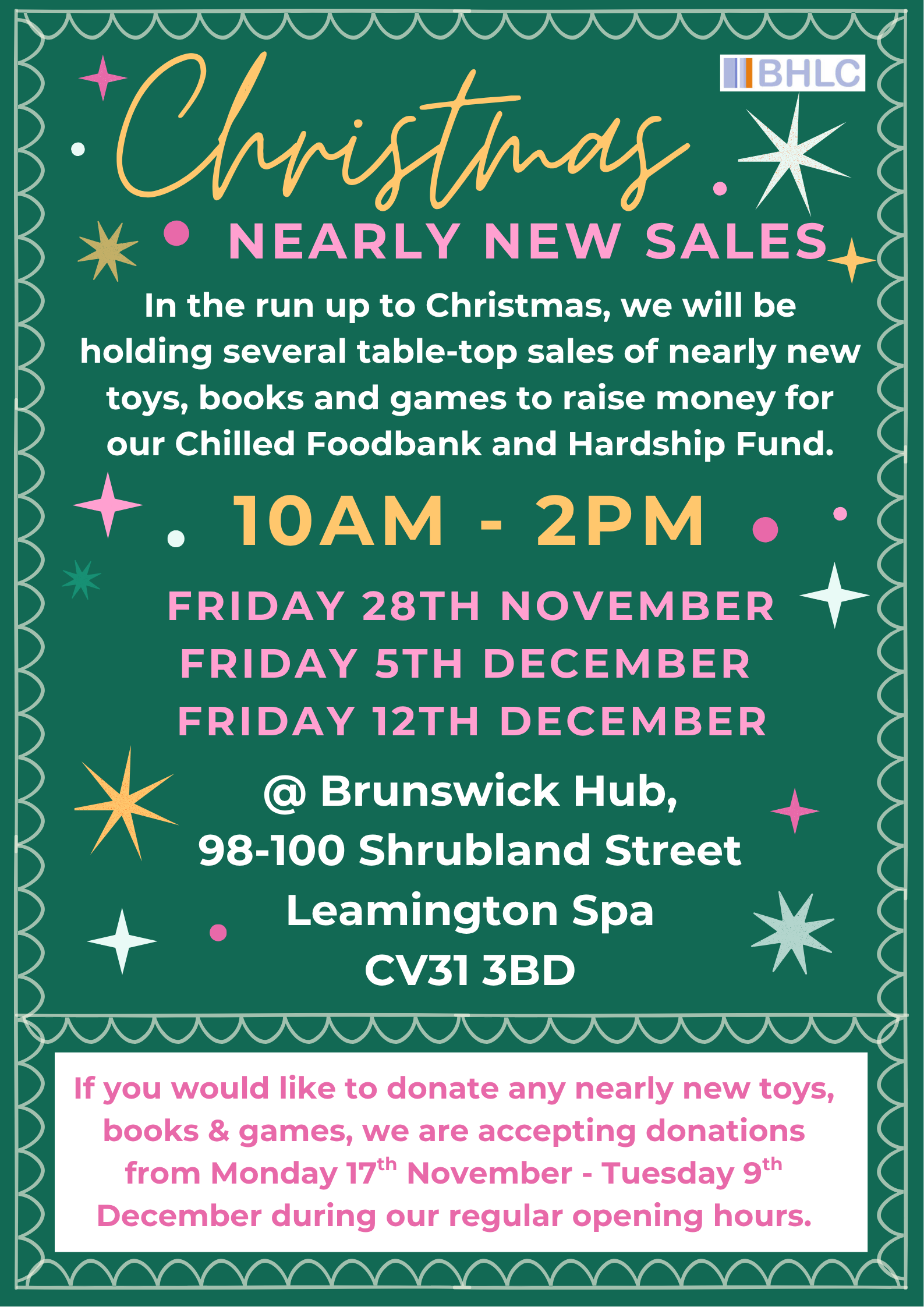 We will be holding several tabletop sales in the run up to Christmas with nearly new toys, games and books.
