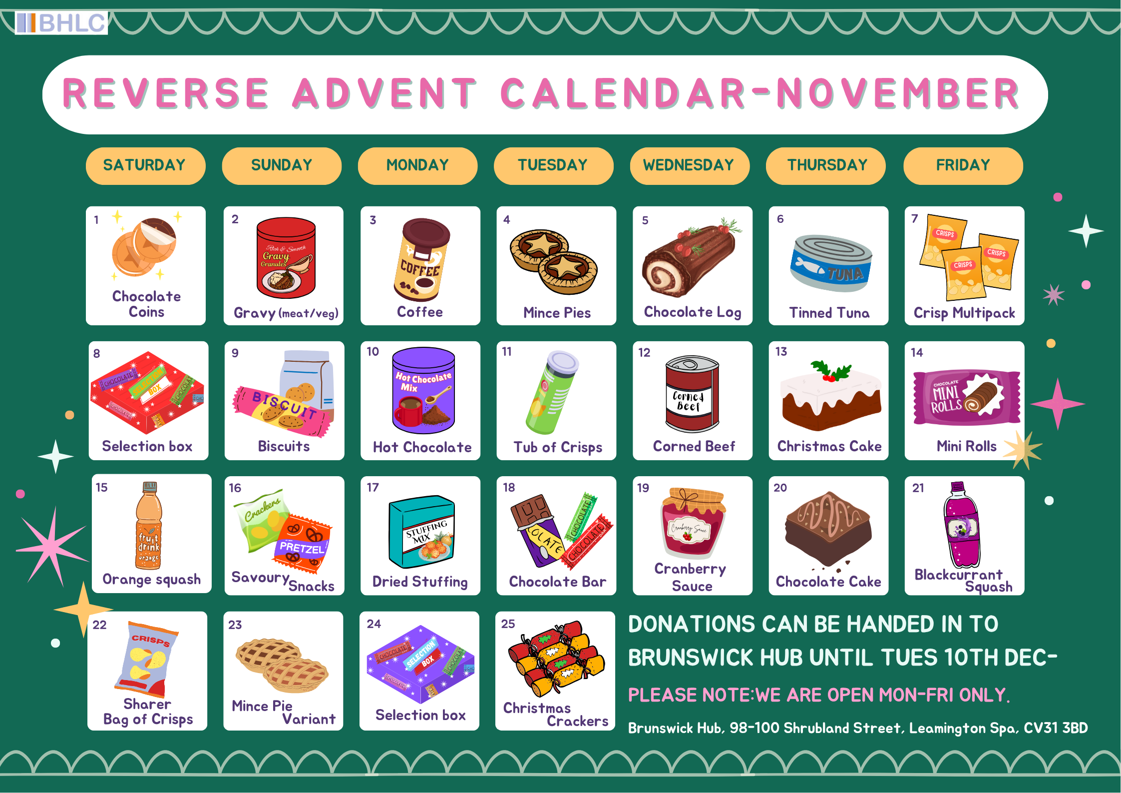 Click here for the revealed Reverse Advent Calendar -You could donate all 25 items or just 2-3, every little helps!